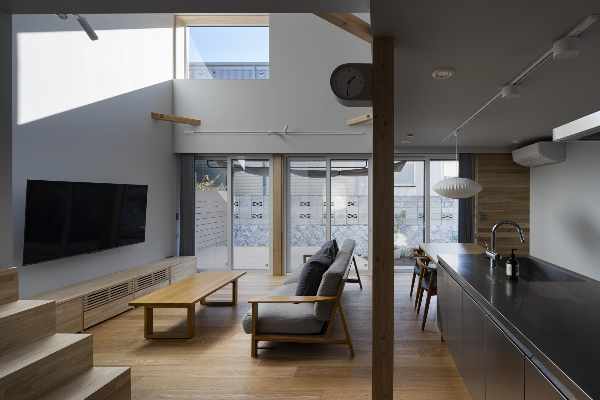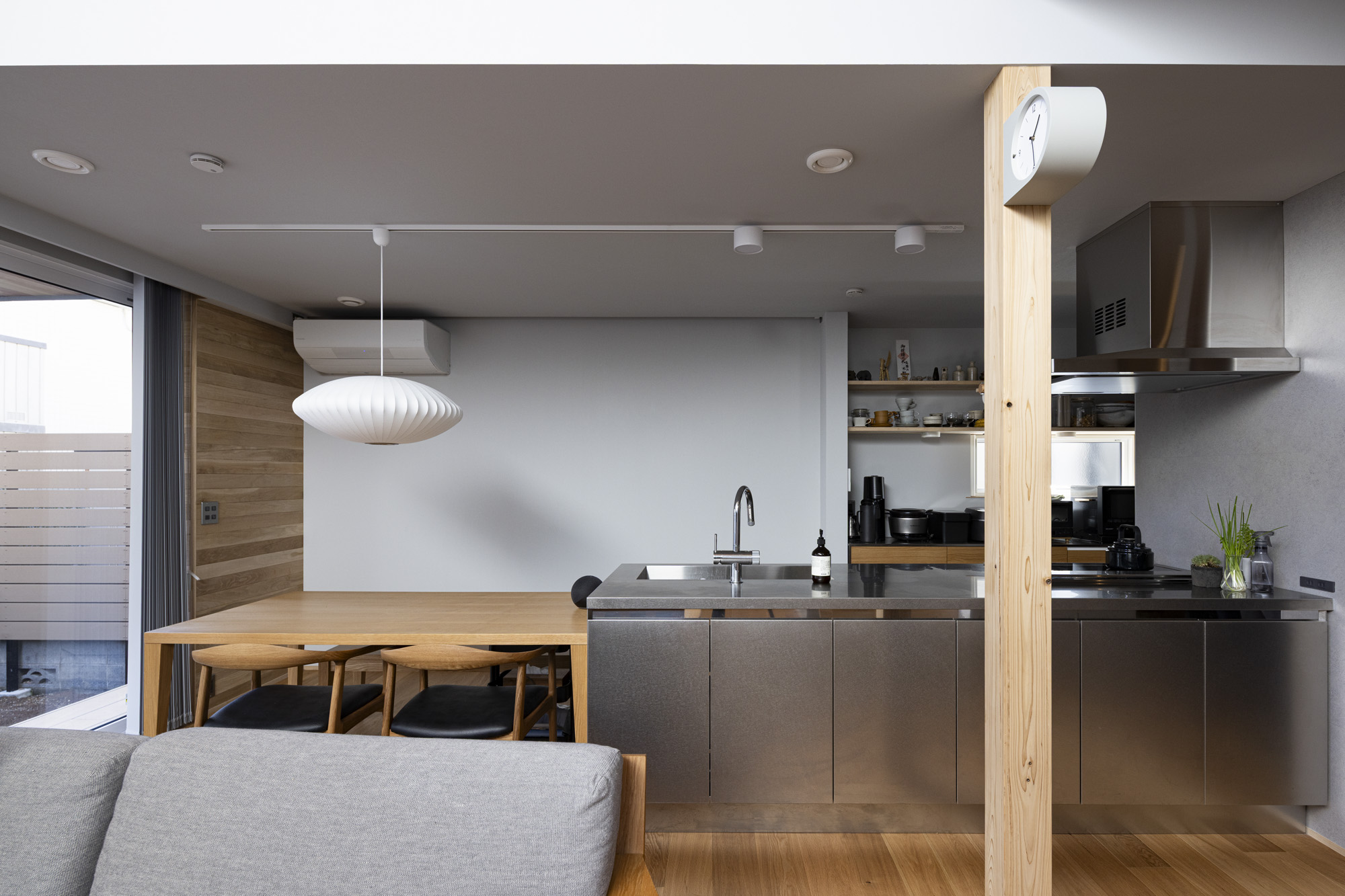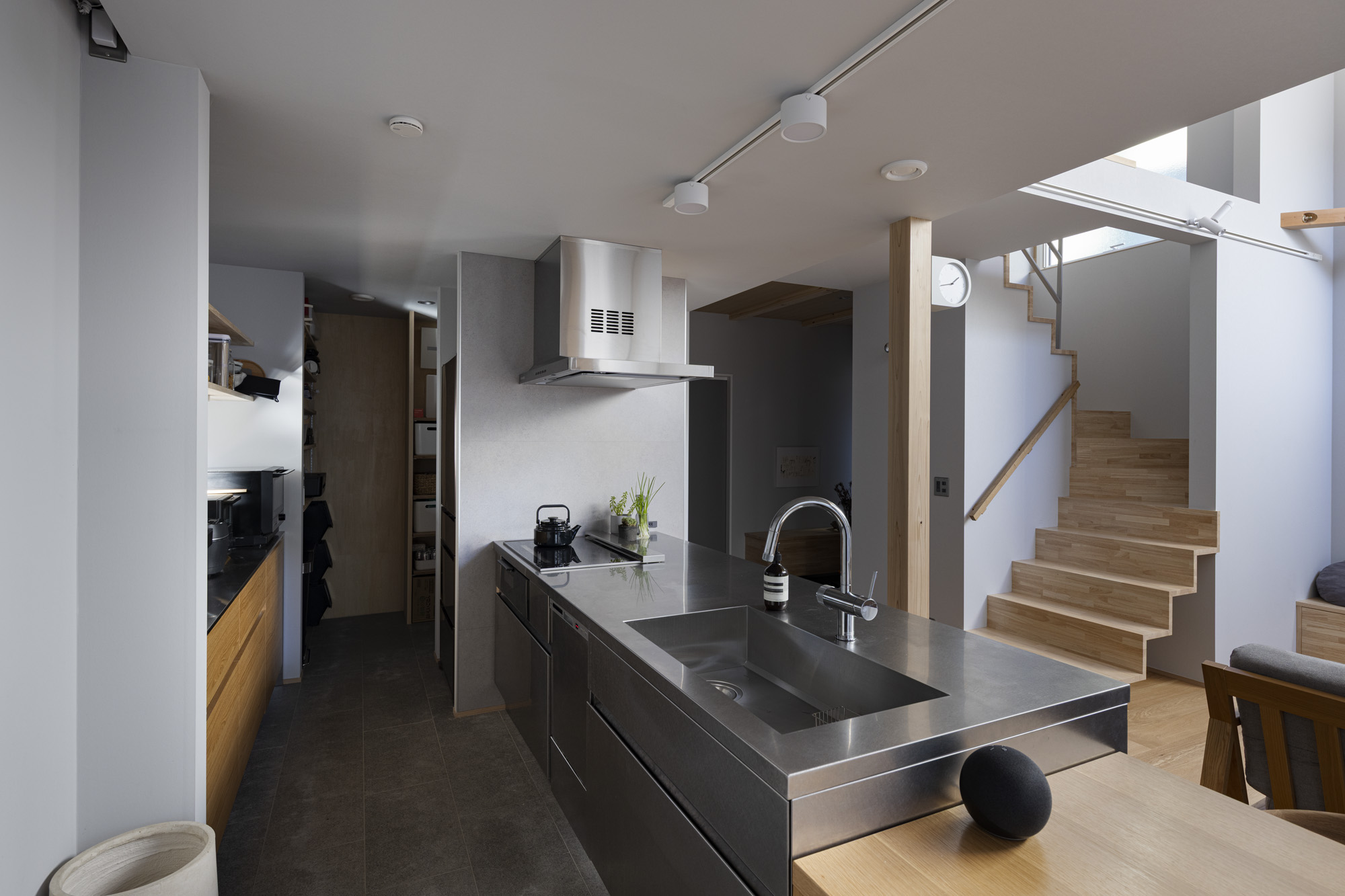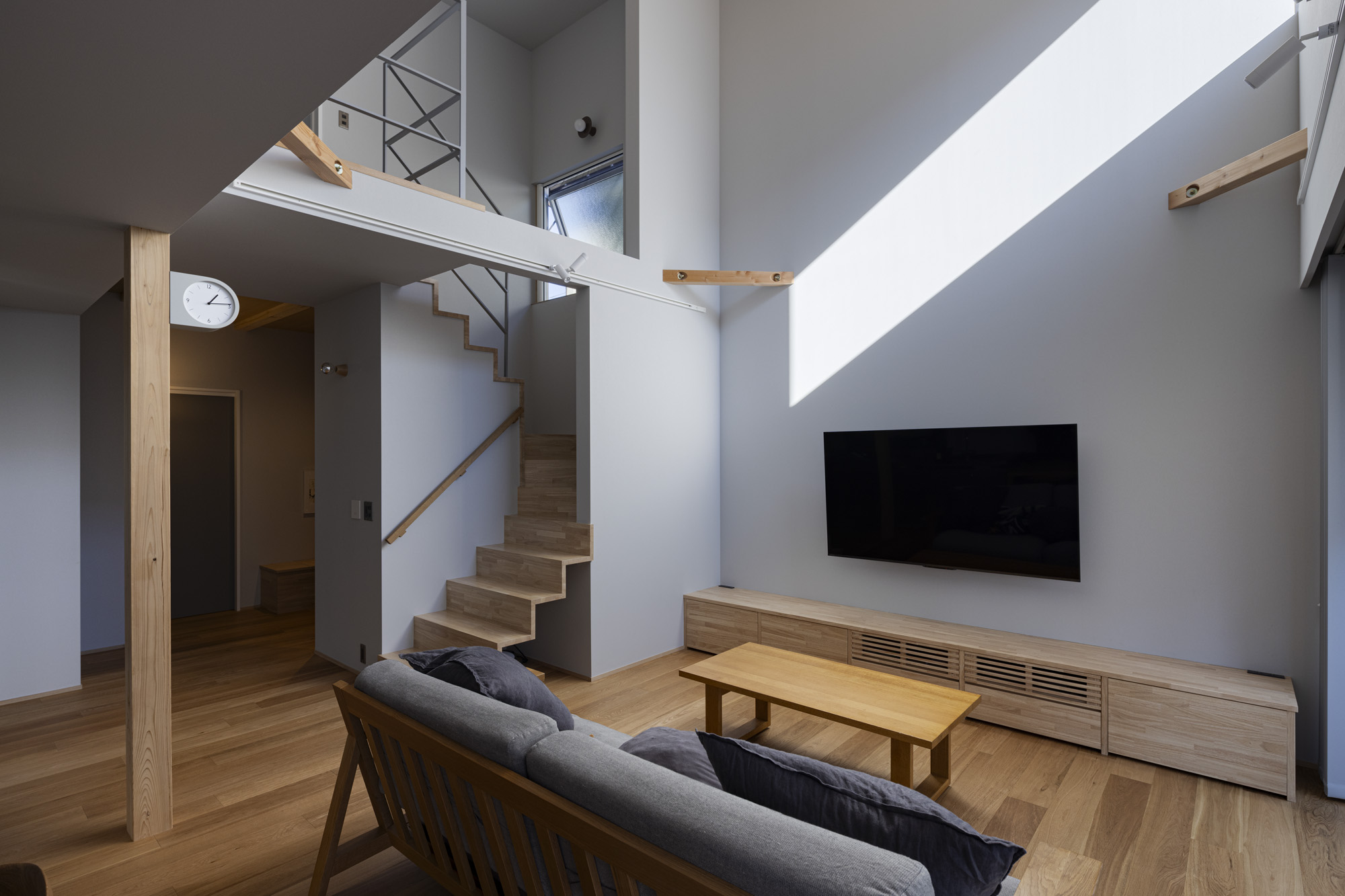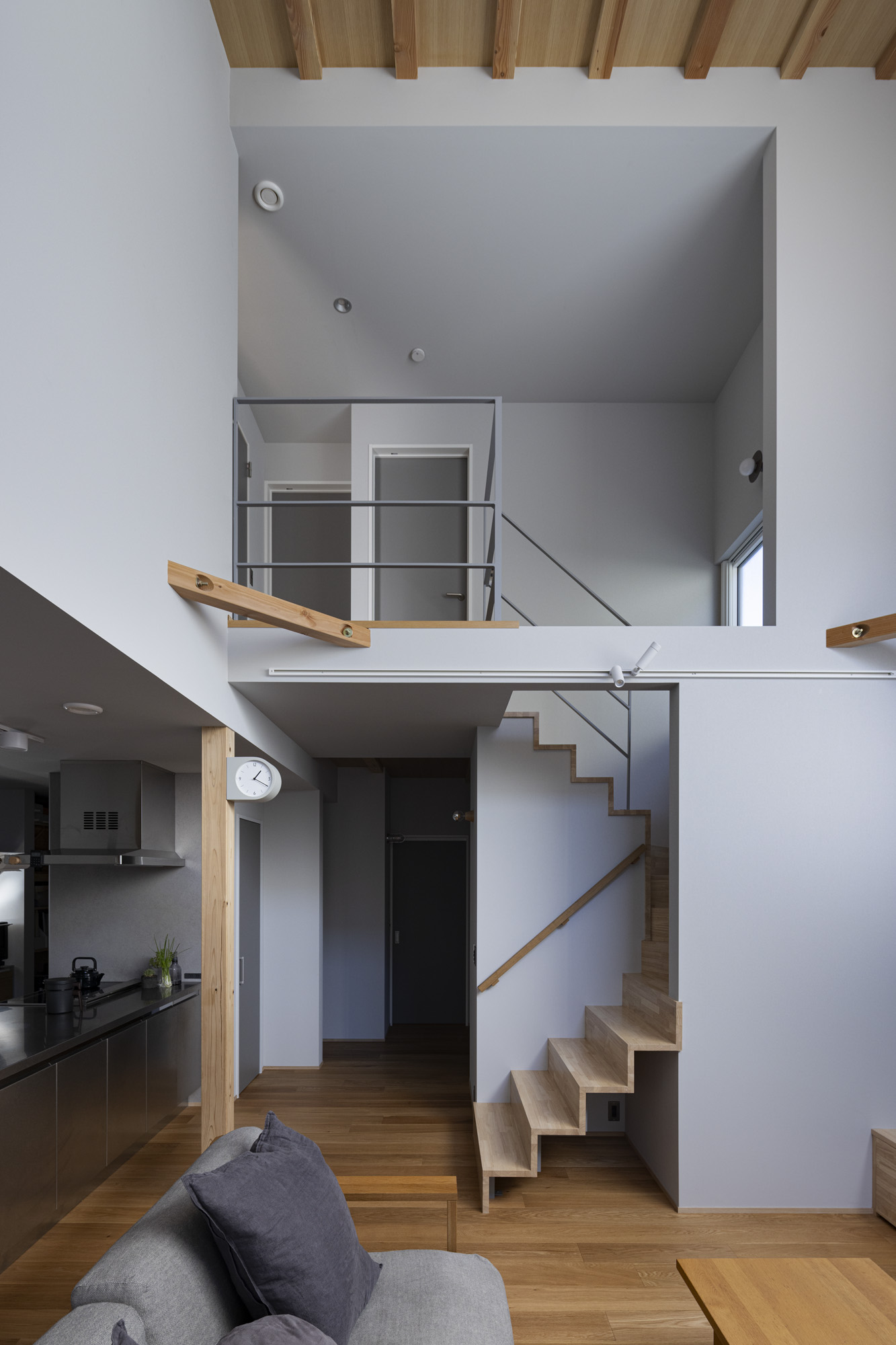 高い天井とそこへ伸びる階段が、空間にダイナミックな奥行きを生み出す住まい。木目の天井がやわらかな温もりを添え、スタイリッシュなキッチンと調和しながら上質な暮らしを演出します。広々としたパントリーは収納力抜群で、日々の家事をスマートにサポート。外へ続くデッキは、家族のくつろぎや仲間との時間をより豊かにしてくれる、心地よいアウトドアスペースです。