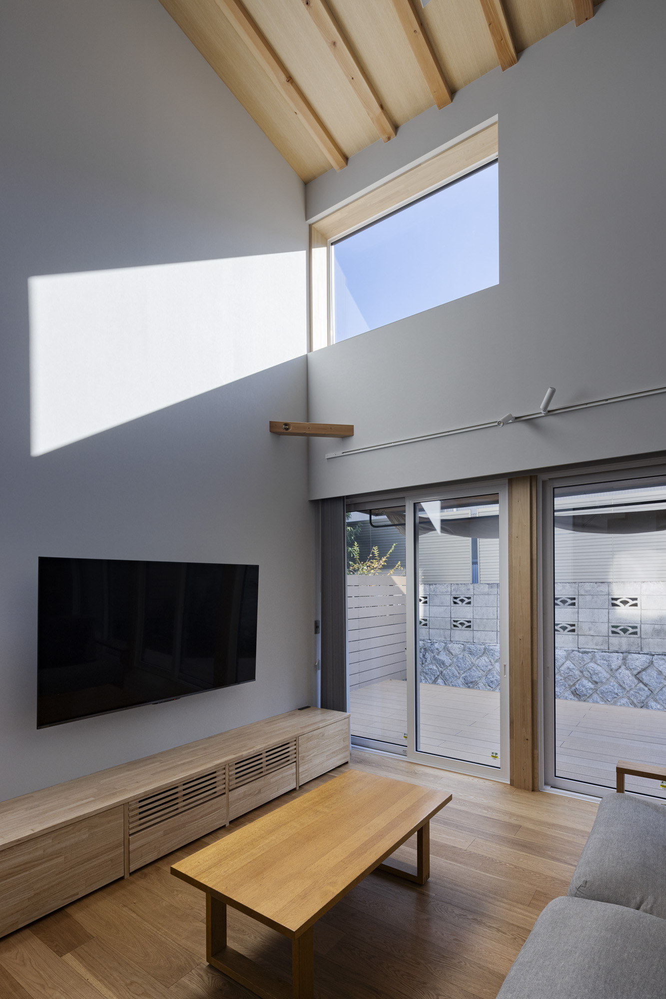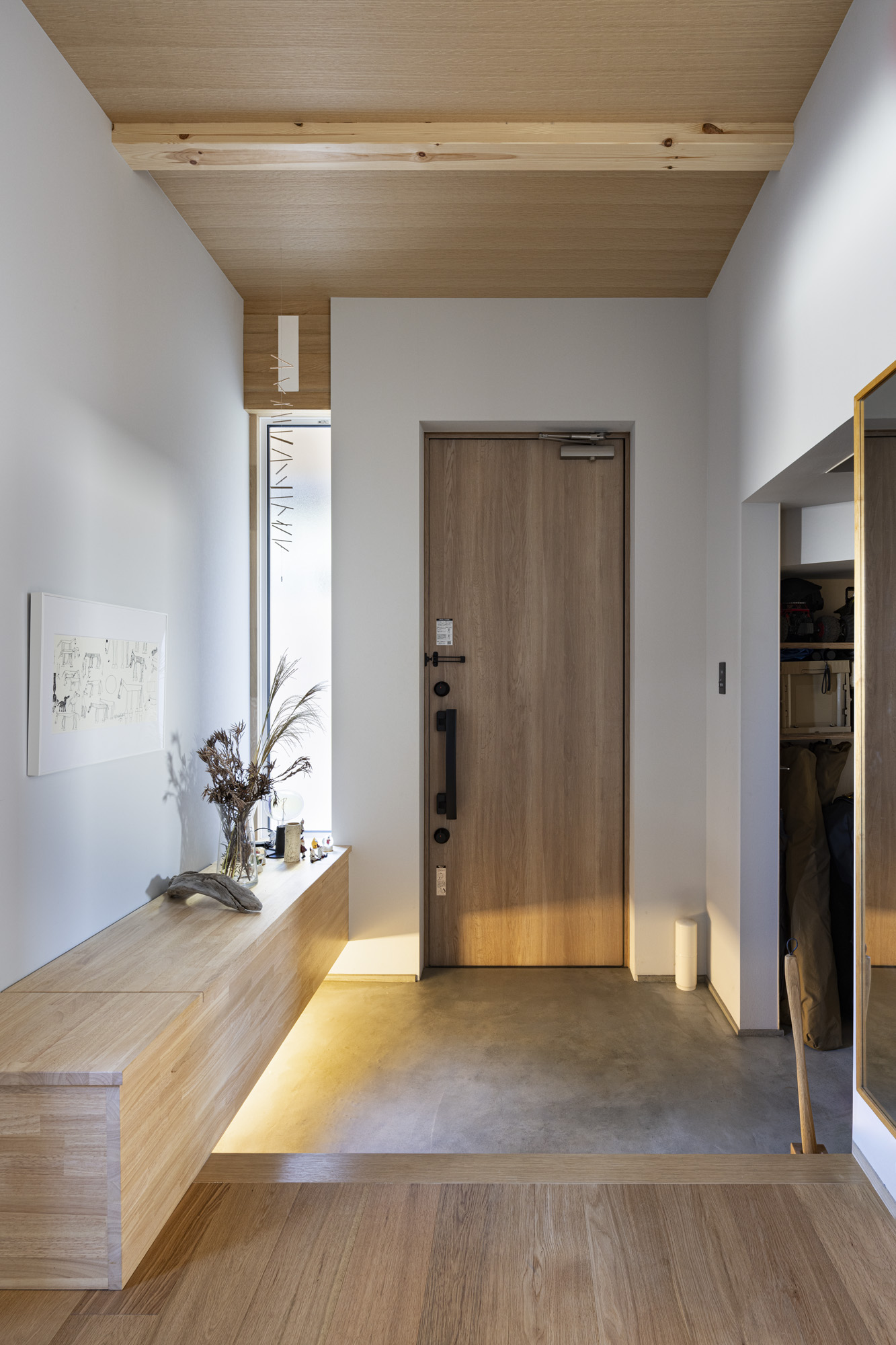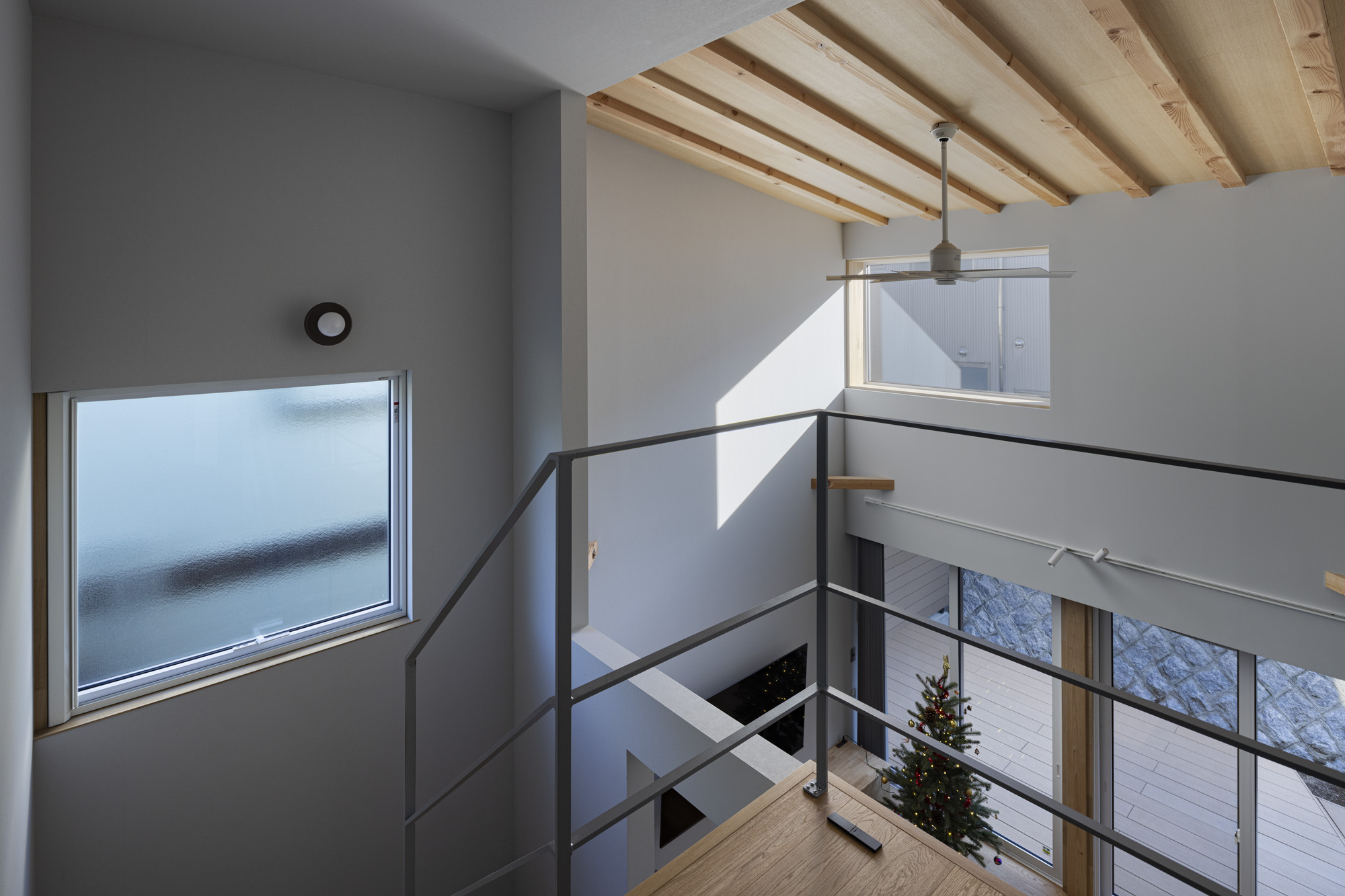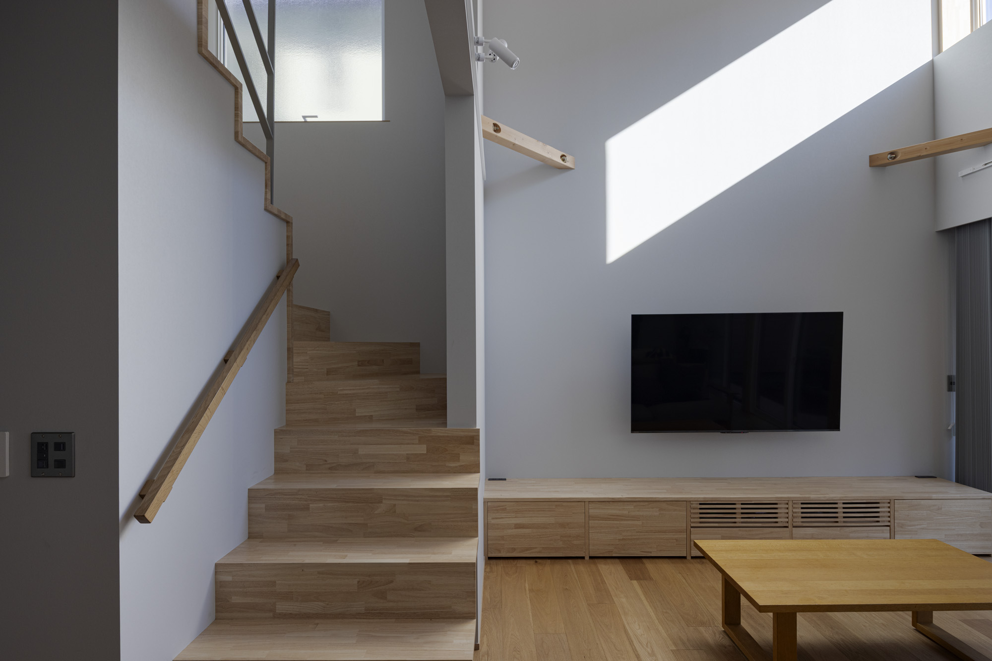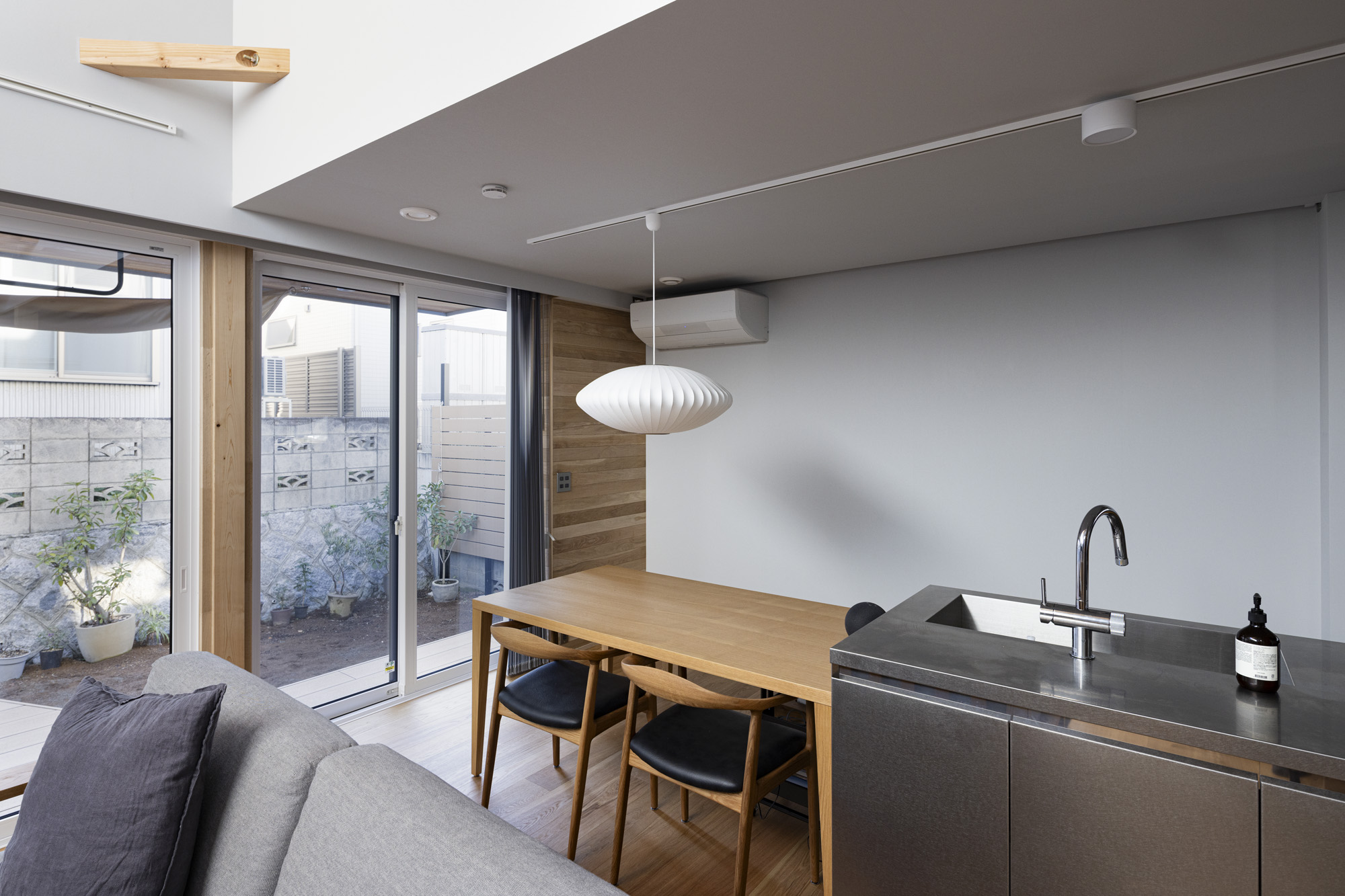 高い天井とそこへ伸びる階段が、空間にダイナミックな奥行きを生み出す住まい。木目の天井がやわらかな温もりを添え、スタイリッシュなキッチンと調和しながら上質な暮らしを演出します。広々としたパントリーは収納力抜群で、日々の家事をスマートにサポート。外へ続くデッキは、家族のくつろぎや仲間との時間をより豊かにしてくれる、心地よいアウトドアスペースです。